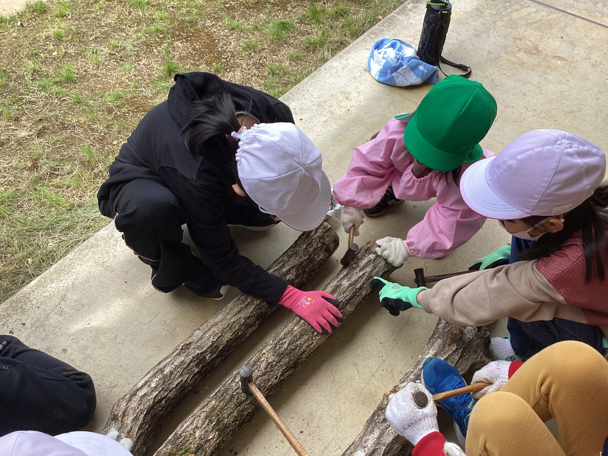 ●学園のお兄さんお姉さんと一緒にしいたけの菌打ち作業です!